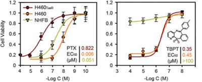 該類化合物具有廣泛的抗腫瘤活性,體外細(xì)胞實(shí)驗(yàn)中其能夠選擇性地殺死耐紫杉醇腫瘤細(xì)胞(H460TaxR,IC50 = 350 nM),對(duì)成纖維細(xì)胞(NHFB)沒有明顯毒性,在小鼠體內(nèi)肺癌(H460和H460TaxR)移植瘤抑制實(shí)驗(yàn)中有明顯效果,可抑制微管蛋白聚合,誘導(dǎo)腫瘤細(xì)胞凋亡。